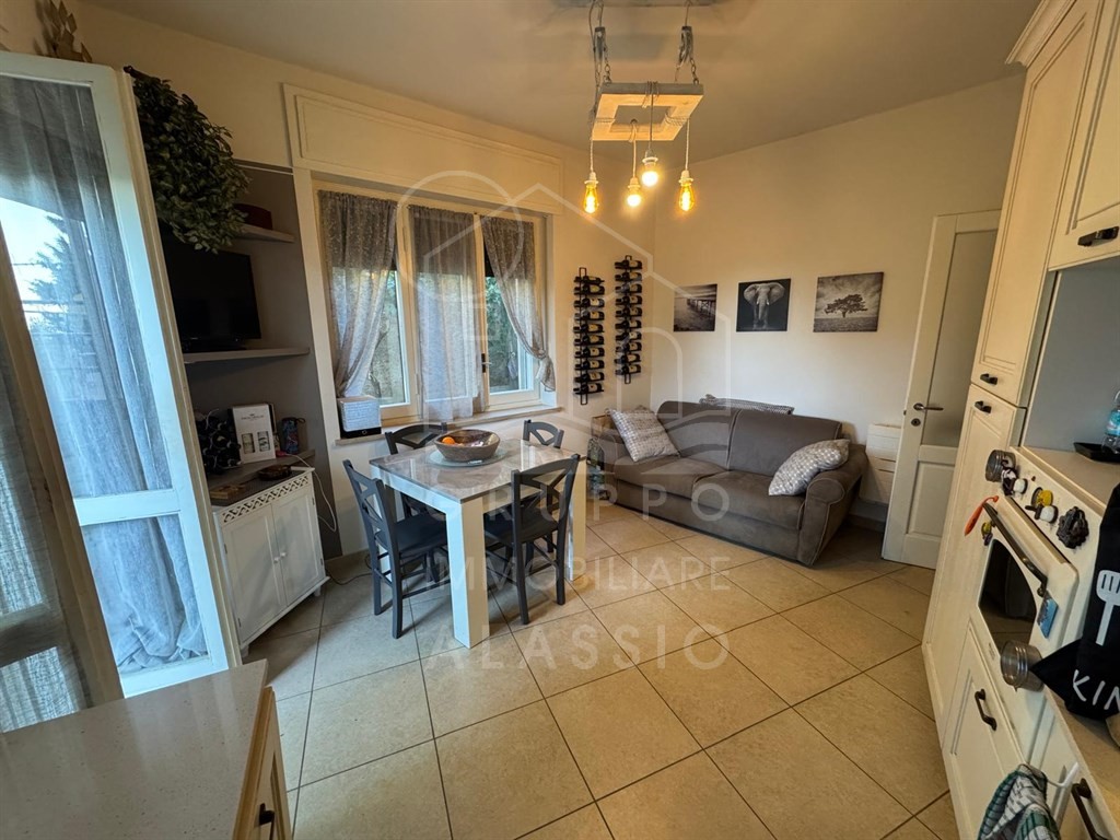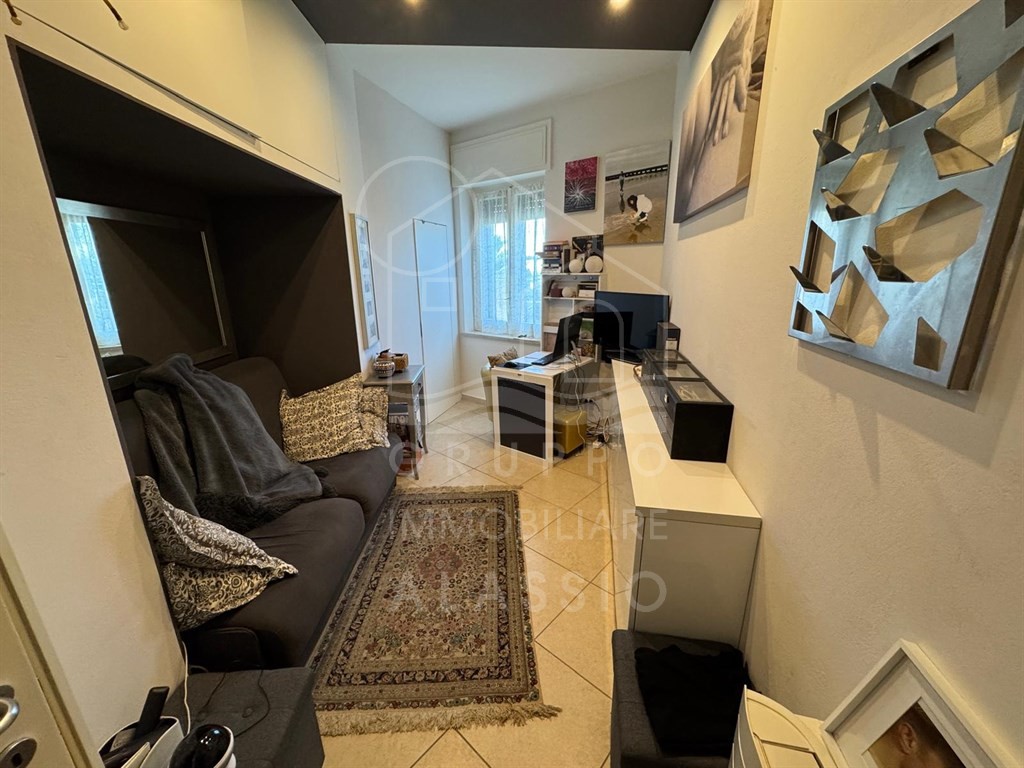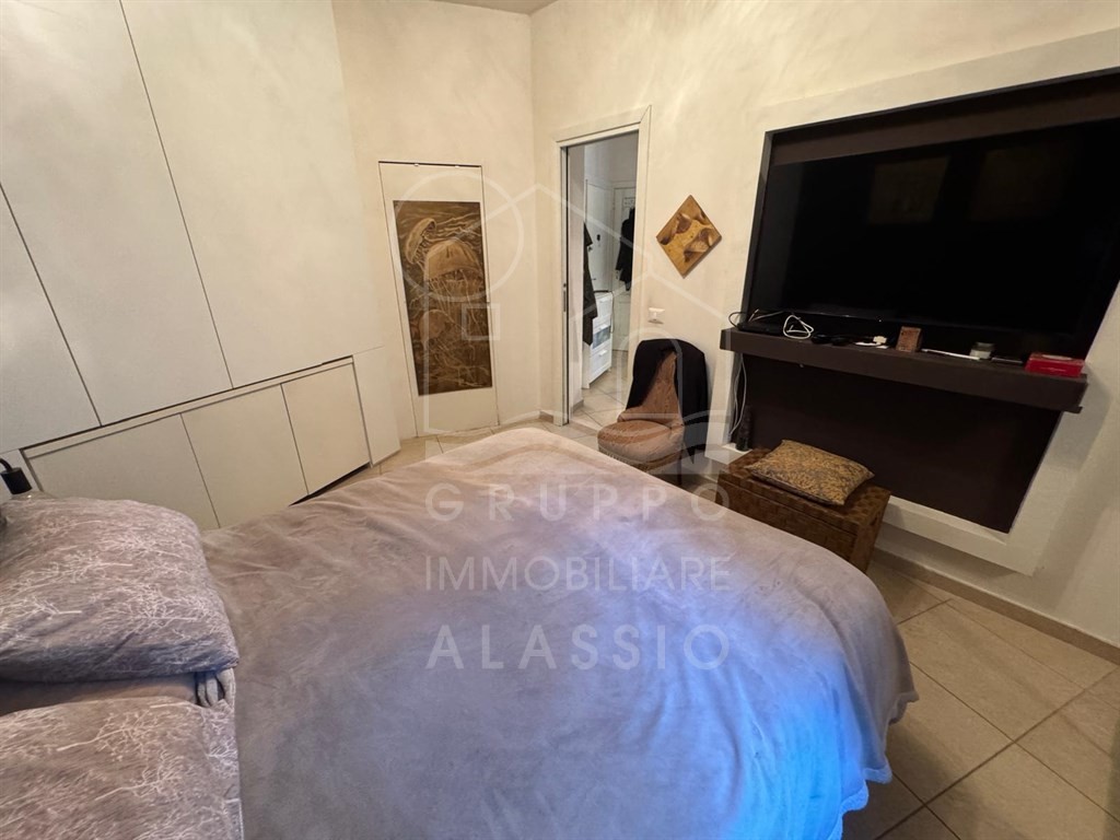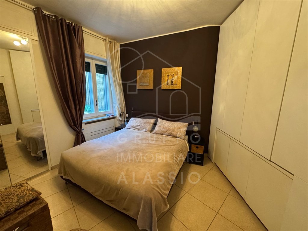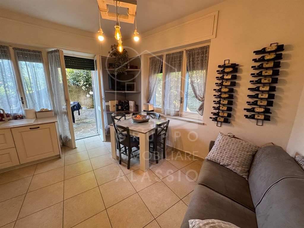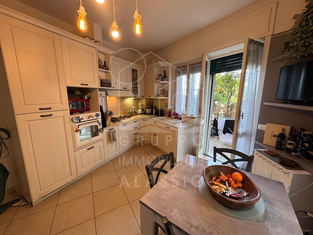 Alassio, prima collina piccolo trilocale ristrutturato con terrazzo con vista mare e giardino privato composto da ingresso, cucina abitabile, 2 camere, bagno e ripostiglio, termo autonomo aria condizionata.