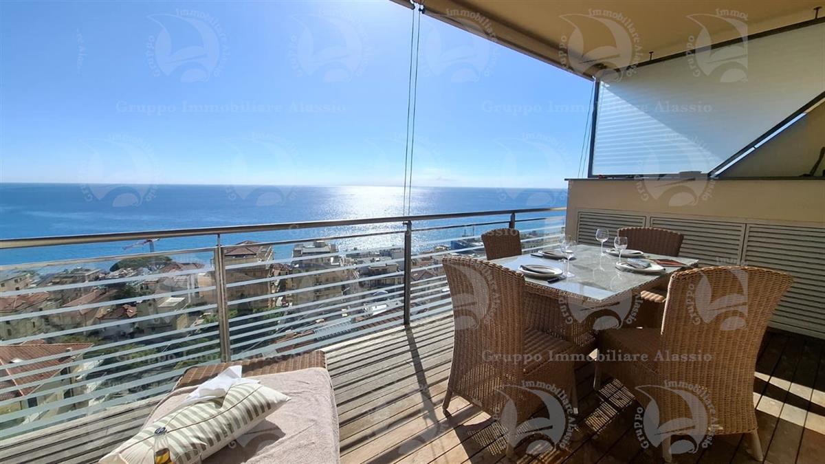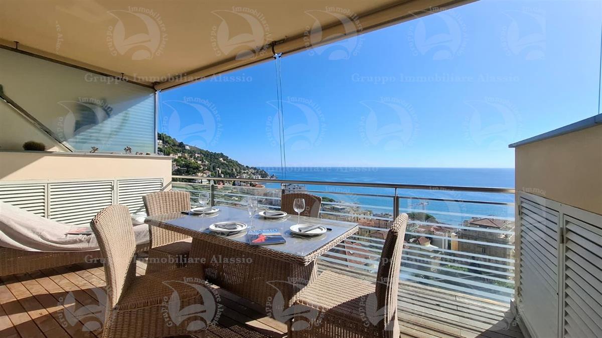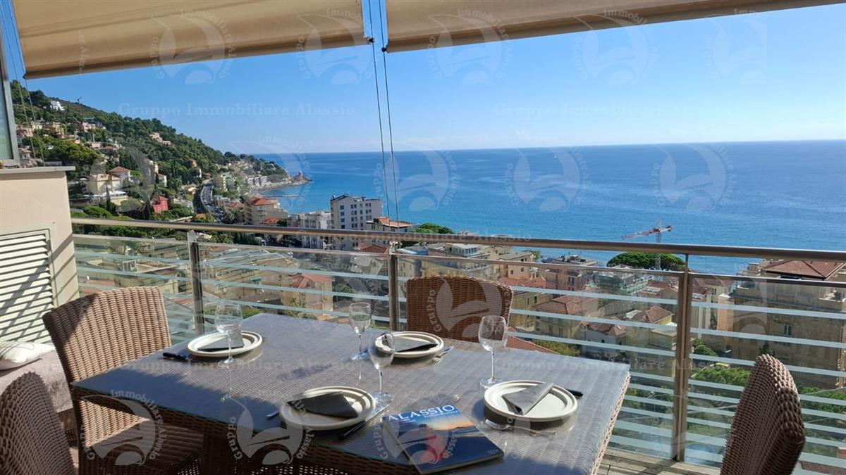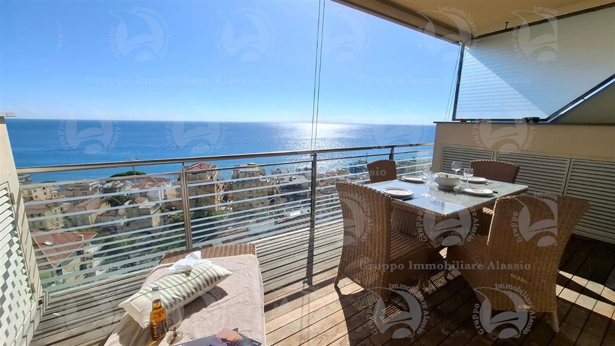 Alassio, primissima collina di levante, proponiamo questo esclusivo bilocale con vetrate vista mare ed un grande terrazzo.L'appartamento è all'interno di un contesto esclusivo, di recente realizzazione dotato di piscina vista mare.Situato al terzo piano fuori terra, l'appartamento è composto da soggiorno con cucina a vista e vetrata vista mare, camera da letto matrimoniale con vetrata vista mare, bagno, terrazzo.Entrambe le stanze accedono direttamente al grande terrazzo da cui si gode la vista totale della Baia del sole. L'arredamento, curato da architetti e realizzato su misura con gusto e qualità, è incluso nel prezzo di vendita.L'appartamento è corredato di un grande e comodo posto auto di proprietà, facilmente accessibile con qualunque auto, dalla supersportiva al grande SUV.E per ricoverare le biciclette, una comoda cantina, raggiungibile senza alcun gradino.