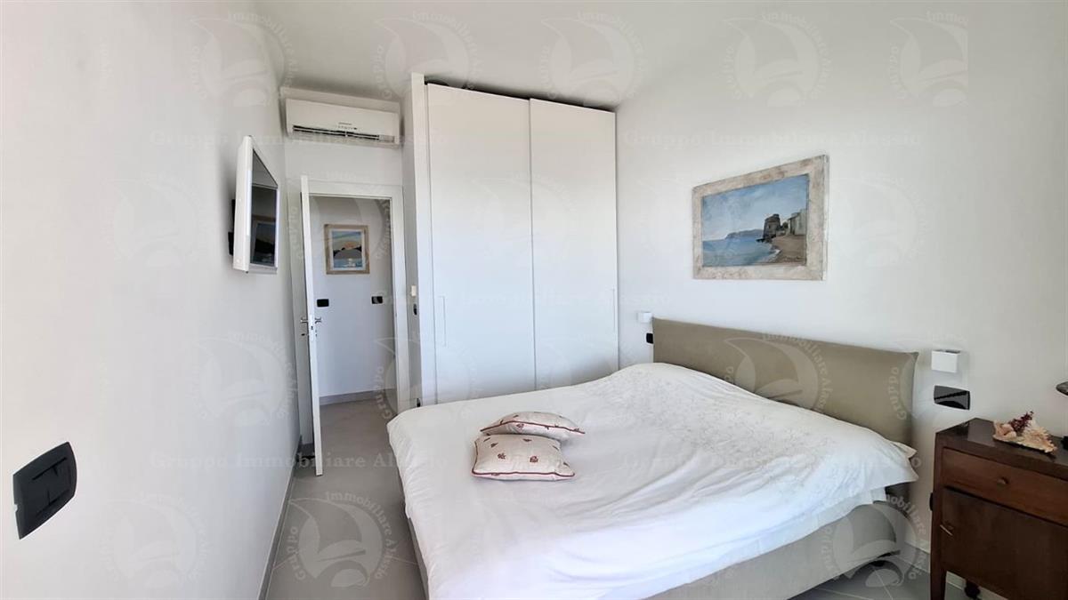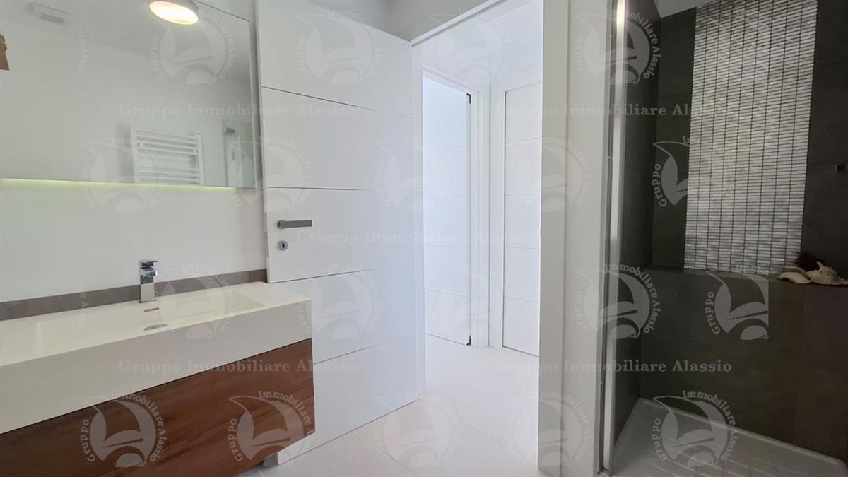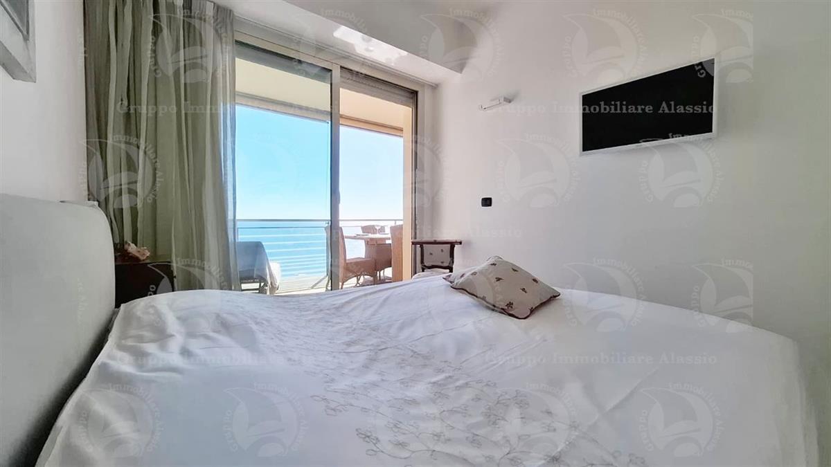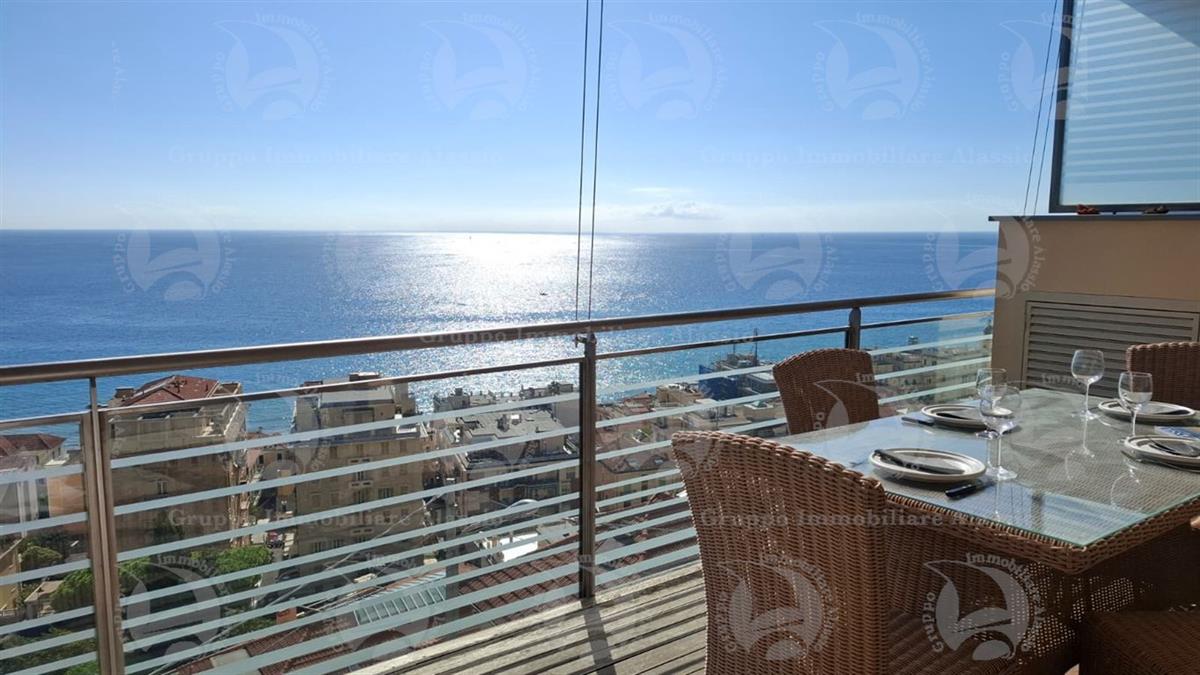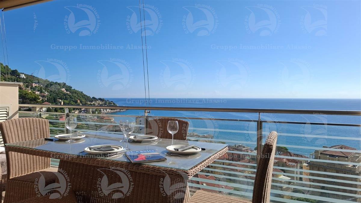 Alassio, primissima collina di levante, proponiamo questo esclusivo bilocale con vetrate vista mare ed un grande terrazzo.L'appartamento è all'interno di un contesto esclusivo, di recente realizzazione dotato di piscina vista mare.Situato al terzo piano fuori terra, l'appartamento è composto da soggiorno con cucina a vista e vetrata vista mare, camera da letto matrimoniale con vetrata vista mare, bagno, terrazzo.Entrambe le stanze accedono direttamente al grande terrazzo da cui si gode la vista totale della Baia del sole. L'arredamento, curato da architetti e realizzato su misura con gusto e qualità, è incluso nel prezzo di vendita.L'appartamento è corredato di un grande e comodo posto auto di proprietà, facilmente accessibile con qualunque auto, dalla supersportiva al grande SUV.E per ricoverare le biciclette, una comoda cantina, raggiungibile senza alcun gradino.