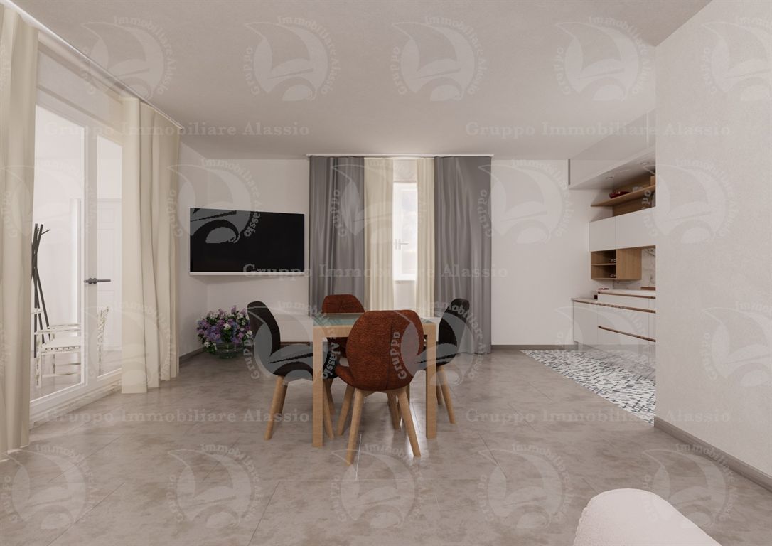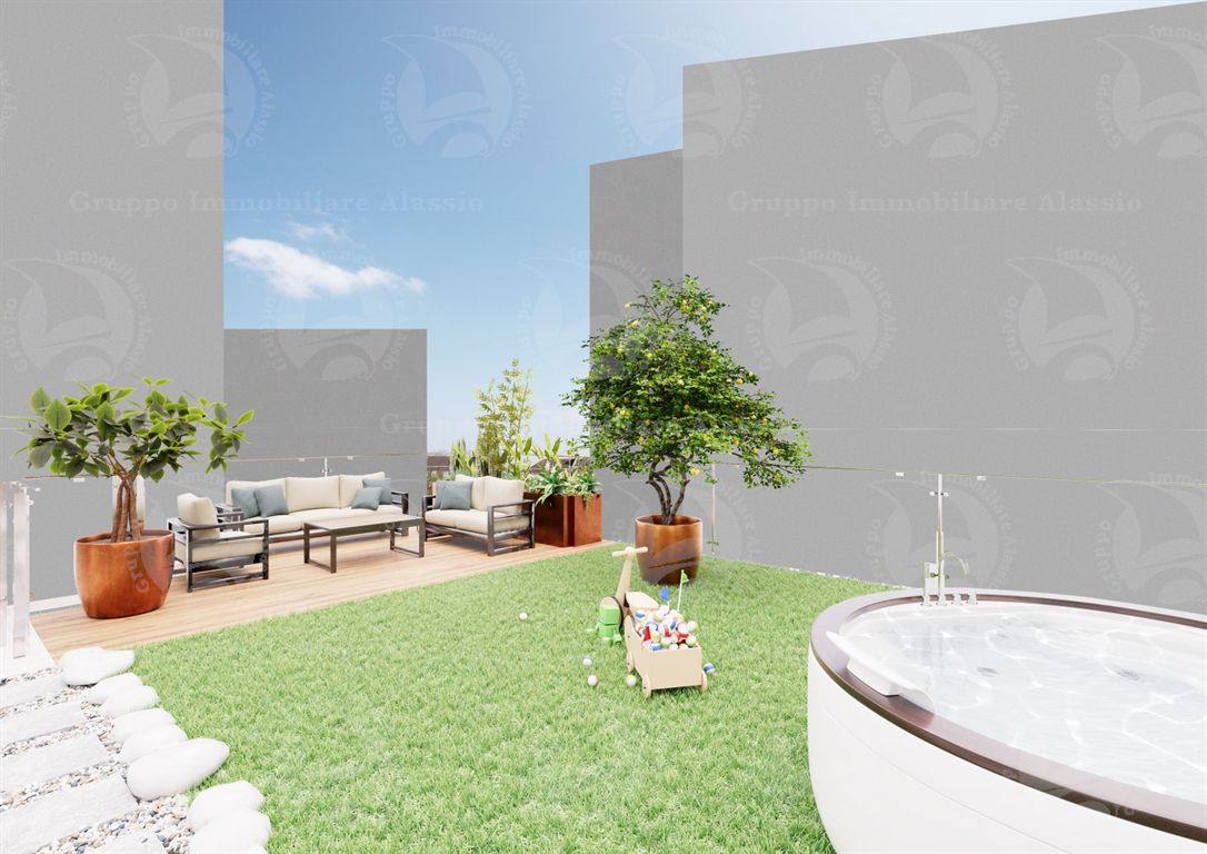 Nel cuore di Alassio, a 100 metri dalla spiaggia, in una elegante palazzina di nuova realizzazione proponiamo in prenotazione appartamento al piano terra con giardino pensile.L'appartamento si compone di soggiorno con angolo cottura con accesso al porticato, due camere d aletto, bagno finestrato e ripostiglio. Grande giardino pensile al piano superiore raggiungibile con scala interna.Sono previste finiture accurate e i materiali di finitura come pavimenti e rivestimenti sono personalizzabili, la consegna è prevista per l'estate 2027.L'immobile sarà in classe energetica A.Le immagini che vi proponiamo sono raffigurazioni al computer di come può essere caratterizzato questo centralissimo trilocale.Tutti i piani saranno serviti da ascensore e ogni appartamento avrà un comodo posto auto sotto casa, prezzo del posto auto € 80.000