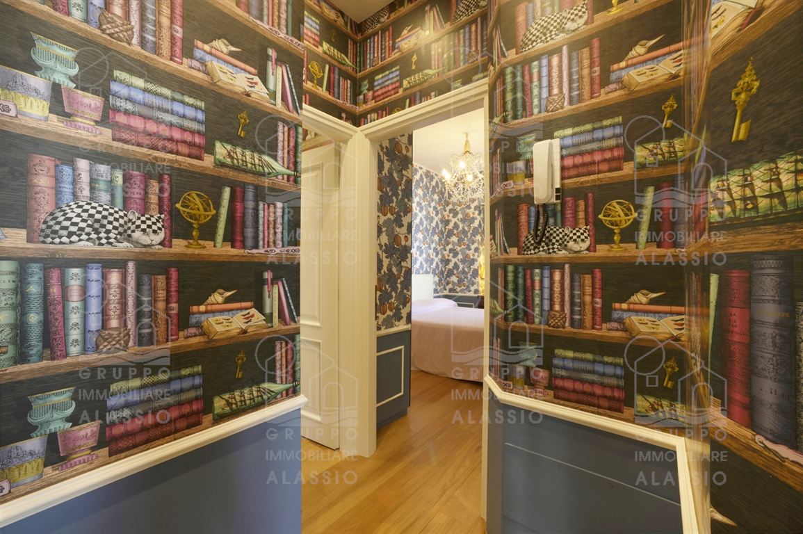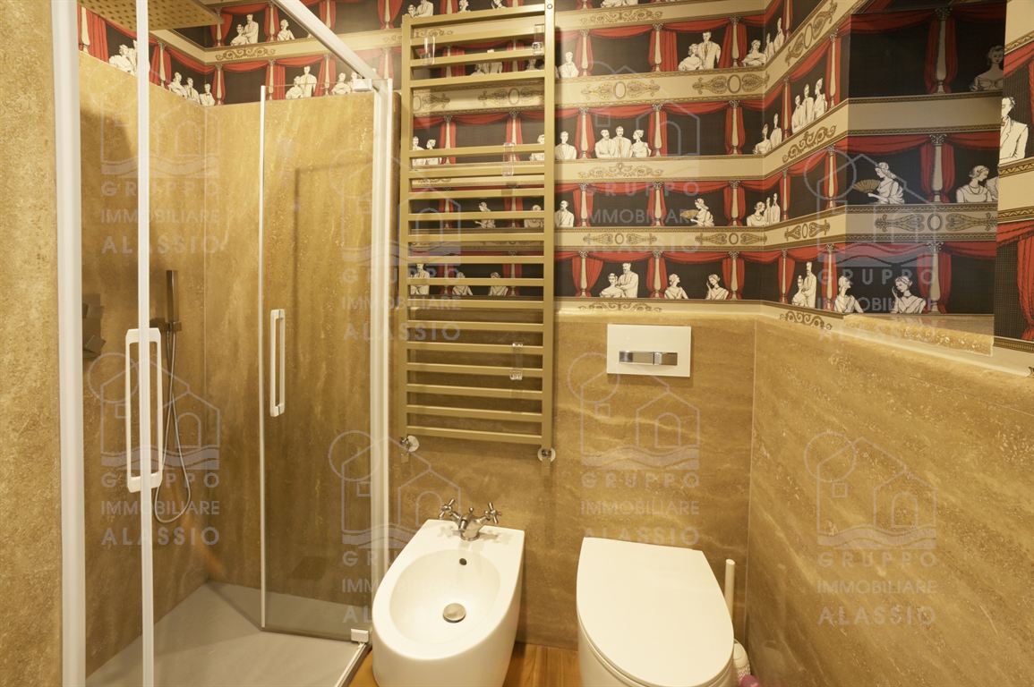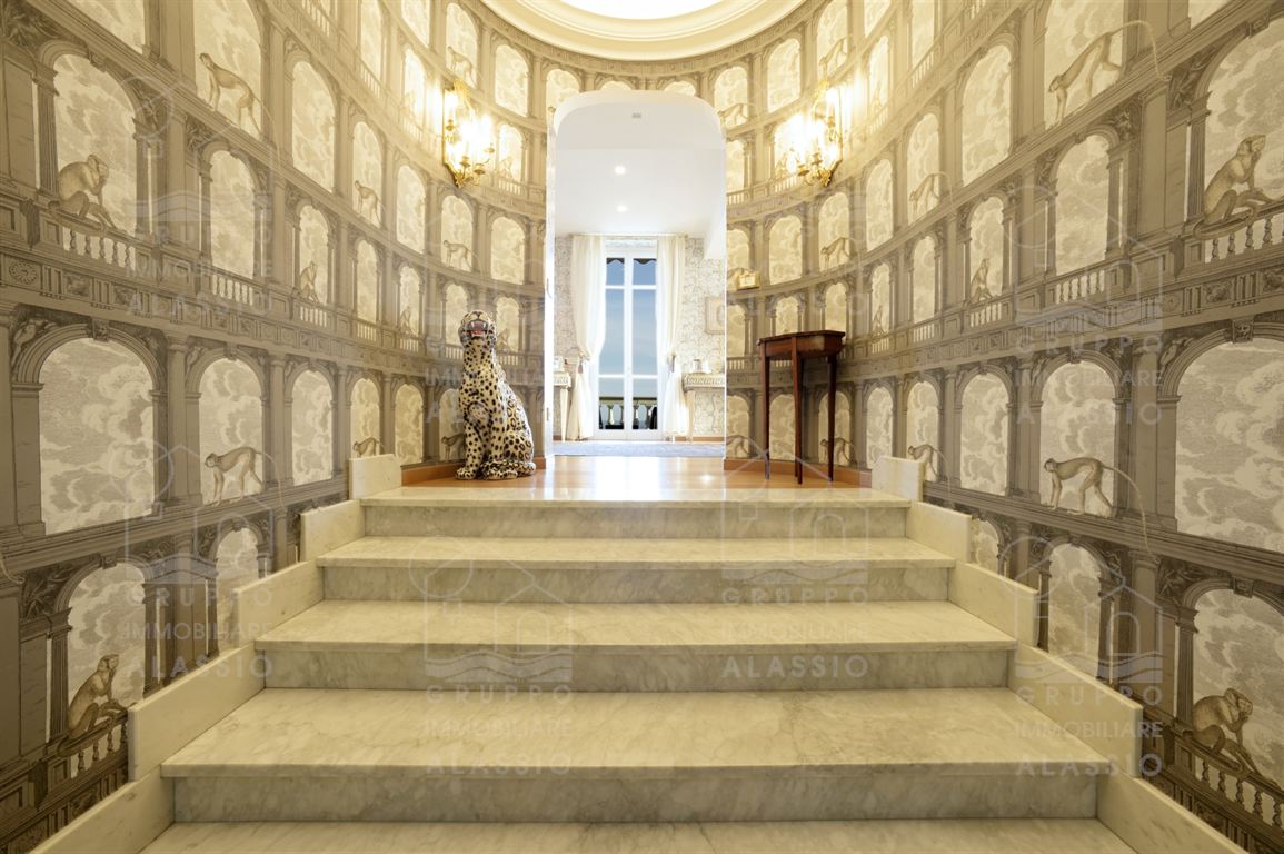 E' difficile trovare ad Alassio un appartamento che abbia tutte le caratteristiche di cui gode questo esclusivo e prestigioso attico vista golfo.A partire dalla sua posizione incastonata come una gemma preziosa nell'esclusiva cornice di Borgo Coscia, soleggiata sino al tramonto.L'edificio è una pregevole villa d'epoca, in ottime condizioni, affacciata sul mare.Entrando nell'appartamento, si è accolti da un ingresso di rappresentanza che prelude al luminoso salone caratterizzato da ben tre portefinestre vista mare e dall'elegante terrazzo sul golfo.Al medesimo livello troviamo la cucina con doppia porta scorrevole verso la zona pranzo del salone, un bagno finestrato, una stanza dedicata alla cabina armadi con zona lavanderia, uno studiolo aperto sulla teatrale scala in cristallo che porta al piano superiore.Qui troviamo l'immancabile suite con terrazzo vista mare, attrezzata con armadi a scomparsa, ed una stanza da bagno finestrata. In questa pregevole dimora tutto parla della sua esclusività; dalle tappezzerie di un noto artista e designer ai ricchi arredi, dalle prestigiose finiture all'eccellente domotica.Completano il piacere di abitare in questo desiderabile attico i due posti auto coperti, facilmente accessibili, e la grande cantina dove poter ricoverare moto, scooter e biciclette.Tutte queste caratteristiche unitamente all'acceso indipendente, al termo autonomo, all'aria condizionata, agli infissi, all'impianto antifurto e tanto altro ancora, rendono questo immobile un riferimento assoluto nel panorama immobiliare di Alassio.