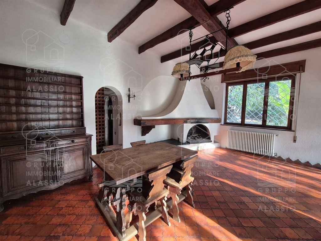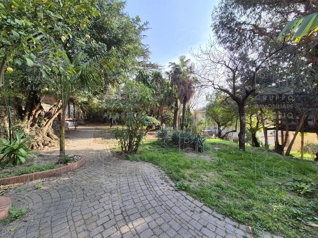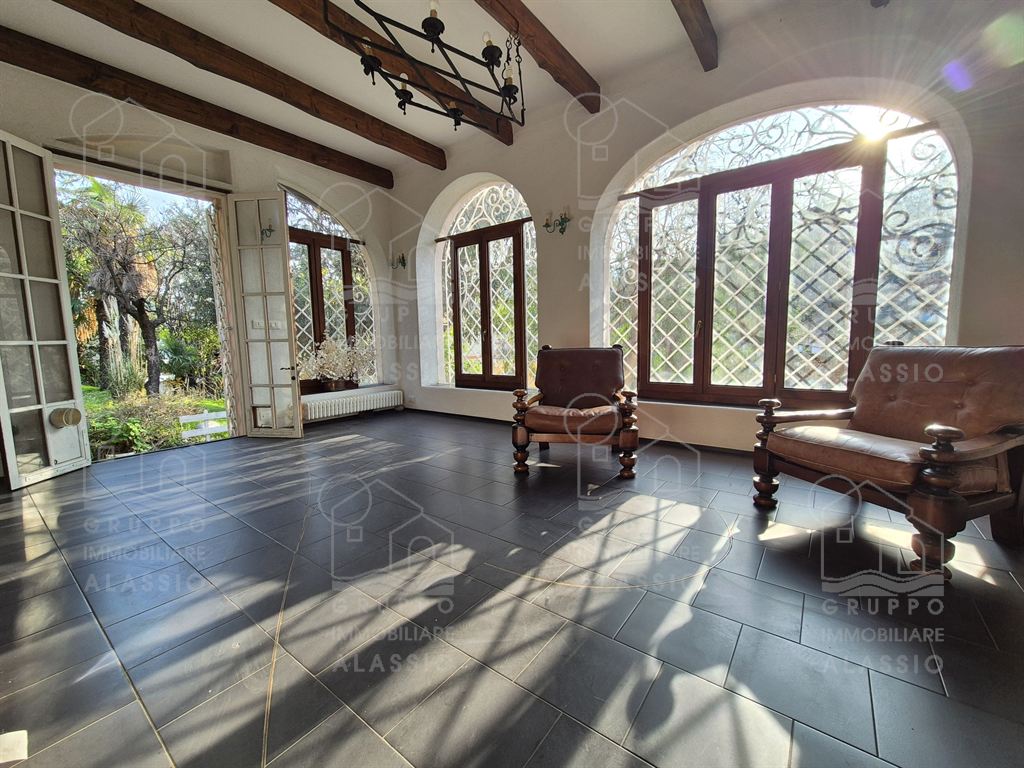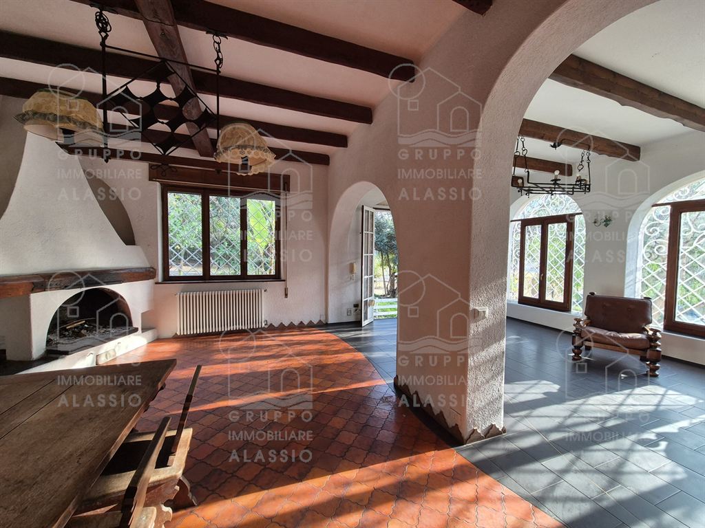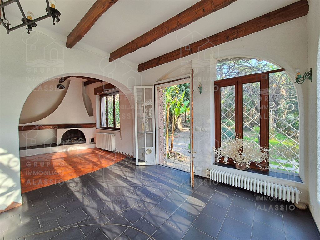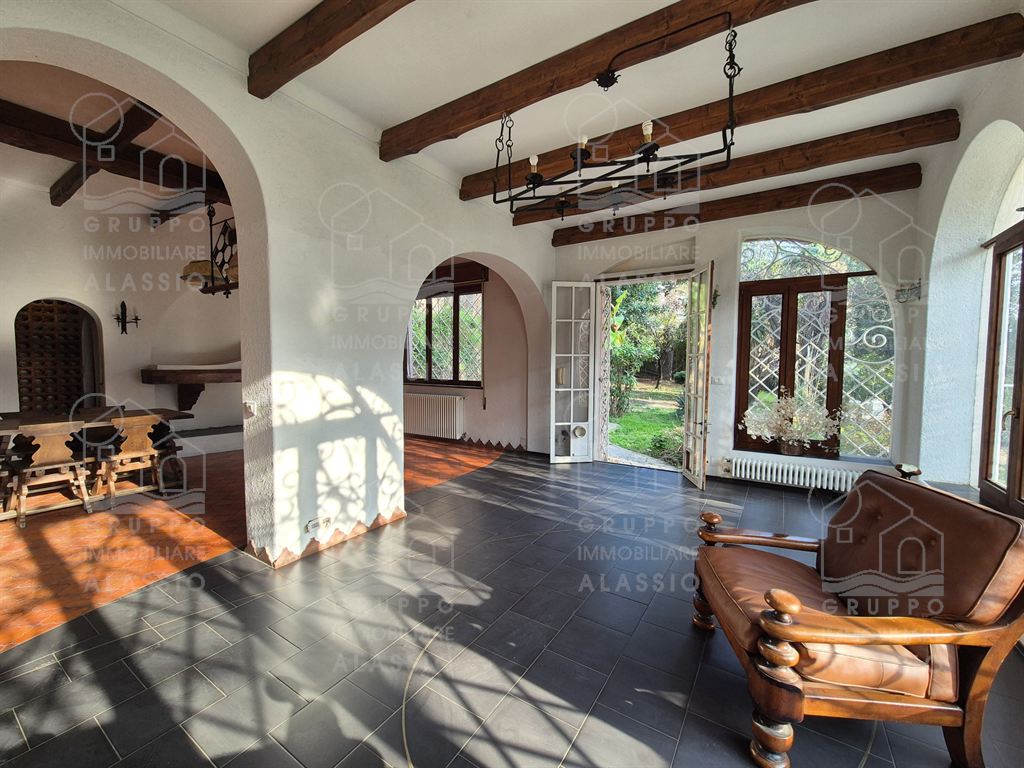 Alassio, porzione indipendente di Villa, terra - cielo, con parco privato e scorcio di vista mare.A meno di 1 km dal mare, in posizione soleggiata, la villa è disposta su due ampi livelli.Al piano terra si è accolti da una luminosa sala angolare con ampie vetrate su entrambi i lati e vista diretta sul parco. Oltre la sala ci aspettano una grande zona pranzo con caminetto artigianale e la zona cucina.Seguono due camere matrimoniali , un bagno finestrato ed un grande ripostiglio / dispensa.Il piano superiore è stato utilizzato come se fosse un appartamento a sé stante. Qui domina il grande e luminoso salone con cucina a vista e doppio accesso al grande terrazzo soleggiato.Seguono una camera da letto matrimoniale ed una stanza da bagno con una grande vasca a livello del pavimento.All'interno del parco privato troviamo poi una sfiziosa dependance di circa 50 mq, da ristrutturare.Il parco è uno spazio verde di elevato pregio, caratterizzato da ampi spazi e magnifici alberi.Un'oasi ideale dove rilassarsi, far giocare i bambini, fare feste con gli amici e indispensabile spazio per i nostri amici a quattro zampe.Gli amanti dell'acqua saranno contenti di sapere che c'è la possibilità di realizzare una piscina.Completano questa esclusiva dimora due box auto.