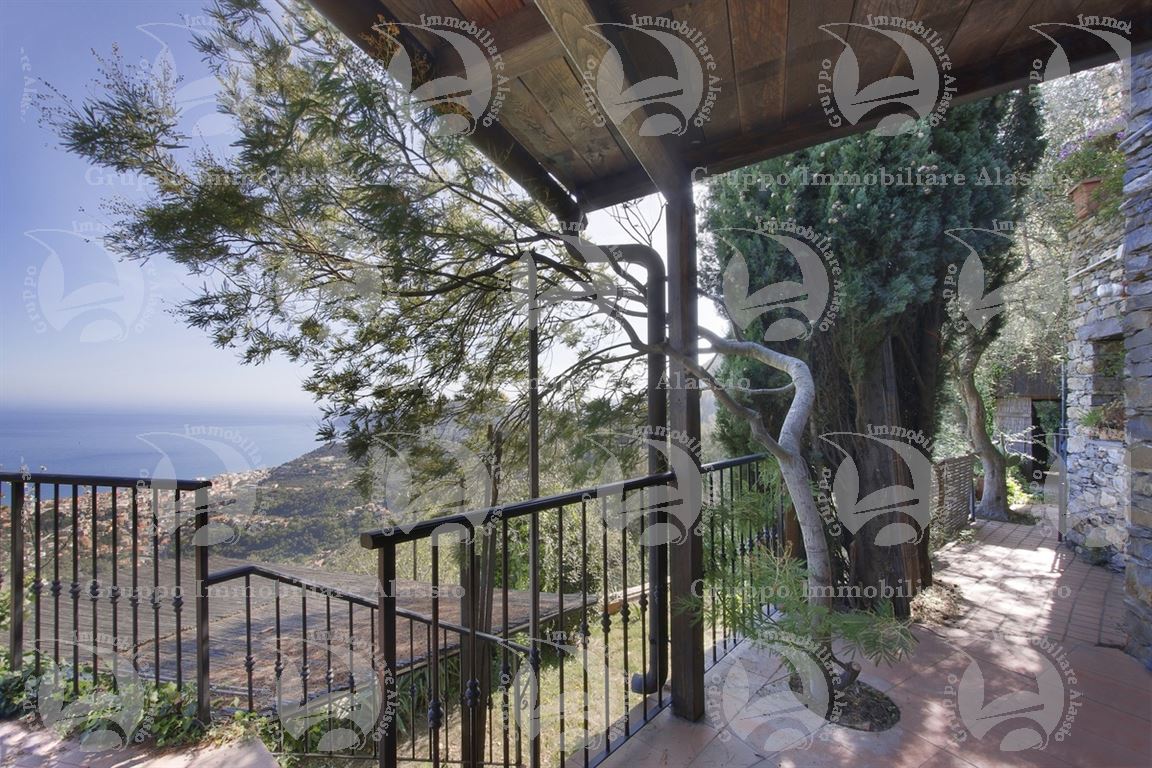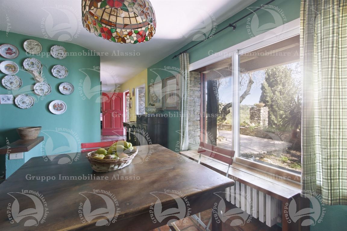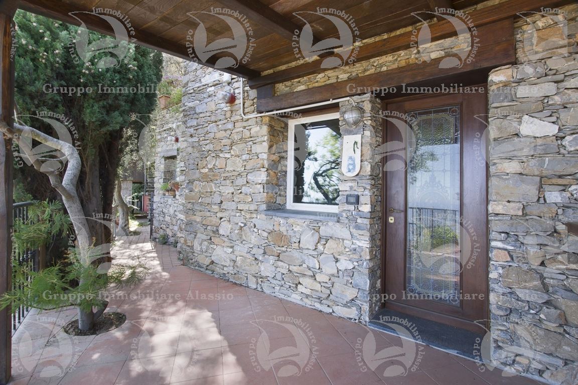 Alassio, sulla collina, zona di Vegliasco, viene proposta una villa su più livelli. Nasce come antico rustico in pietra, totalmente recuperato, negli anni 1981/82, mantenendo l'architettura e i materiali dell'epoca e principalmente la pietra a vista lavorata tutta a "faccia a vista", totalmente scagliata e dove non si doveva lasciar vedere il cemento usato per rinforzarla. Siamo a quota 402 s.l.m. dalla quale si ammira una stupenda vista del golfo di Alassio e baciata dal sole, che nasce dal mare, sin dai primi minuti della giornata. Da ogni angolo della villa, si ammira la meraviglia della collina sino al mare.Le soglie sono in ardesia a spacco, i pavimenti In cotto d’epoca in zona giorno e in legno massello in zona notte. Bagni e cucine in cera sarda con doppio lavello e dotati sia vasca che di doccia. Tre camini a legna, per serate romantiche davanti al focolare, barbecue e forno per pizze, nelle varie zone della villa, per serate spensierate con amici. Il corpo principale della villa è di 220 m² + 65 m² di porticato + 60 m² di terrazzi. Un piccolo bilocale di 65 m² con 30 m² di terrazzo. Una taverna di 50 m² + 30 m² di terrazzo + 10 m² di terrazzo.Terreno piantumato, con molteplici alberi da frutto e olivi, di 600 m². Un'ampia cantina e per finire un box auto doppio di 55 m².