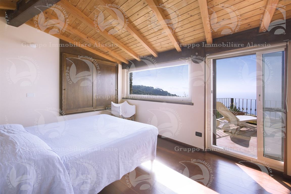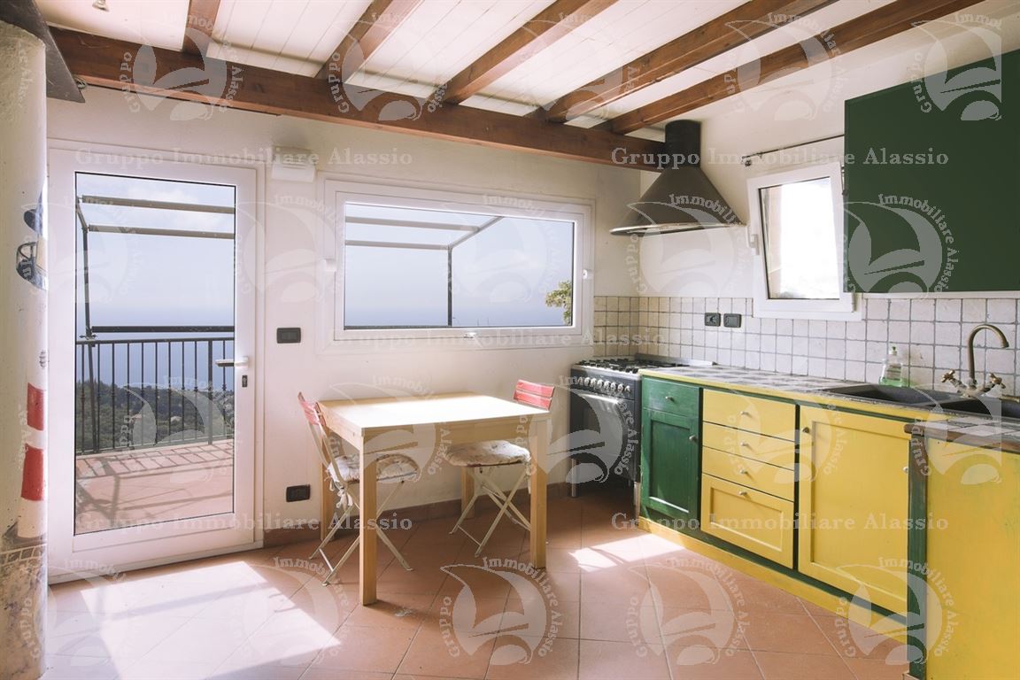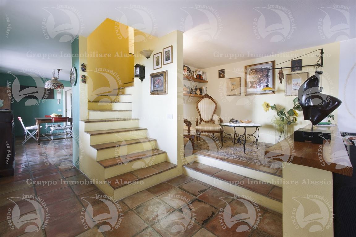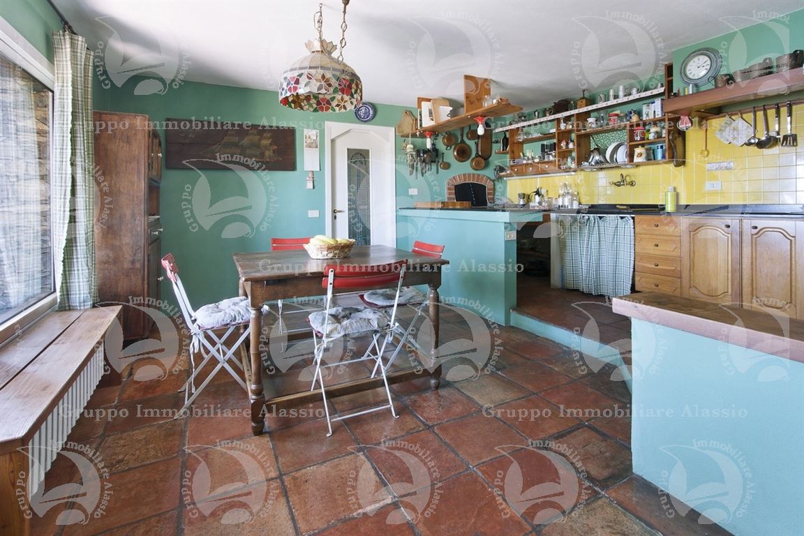 Alassio, sulla collina, zona di Vegliasco, viene proposta una villa su più livelli. Nasce come antico rustico in pietra, totalmente recuperato, negli anni 1981/82, mantenendo l'architettura e i materiali dell'epoca e principalmente la pietra a vista lavorata tutta a "faccia a vista", totalmente scagliata e dove non si doveva lasciar vedere il cemento usato per rinforzarla. Siamo a quota 402 s.l.m. dalla quale si ammira una stupenda vista del golfo di Alassio e baciata dal sole, che nasce dal mare, sin dai primi minuti della giornata. Da ogni angolo della villa, si ammira la meraviglia della collina sino al mare.Le soglie sono in ardesia a spacco, i pavimenti In cotto d’epoca in zona giorno e in legno massello in zona notte. Bagni e cucine in cera sarda con doppio lavello e dotati sia vasca che di doccia. Tre camini a legna, per serate romantiche davanti al focolare, barbecue e forno per pizze, nelle varie zone della villa, per serate spensierate con amici. Il corpo principale della villa è di 220 m² + 65 m² di porticato + 60 m² di terrazzi. Un piccolo bilocale di 65 m² con 30 m² di terrazzo. Una taverna di 50 m² + 30 m² di terrazzo + 10 m² di terrazzo.Terreno piantumato, con molteplici alberi da frutto e olivi, di 600 m². Un'ampia cantina e per finire un box auto doppio di 55 m².